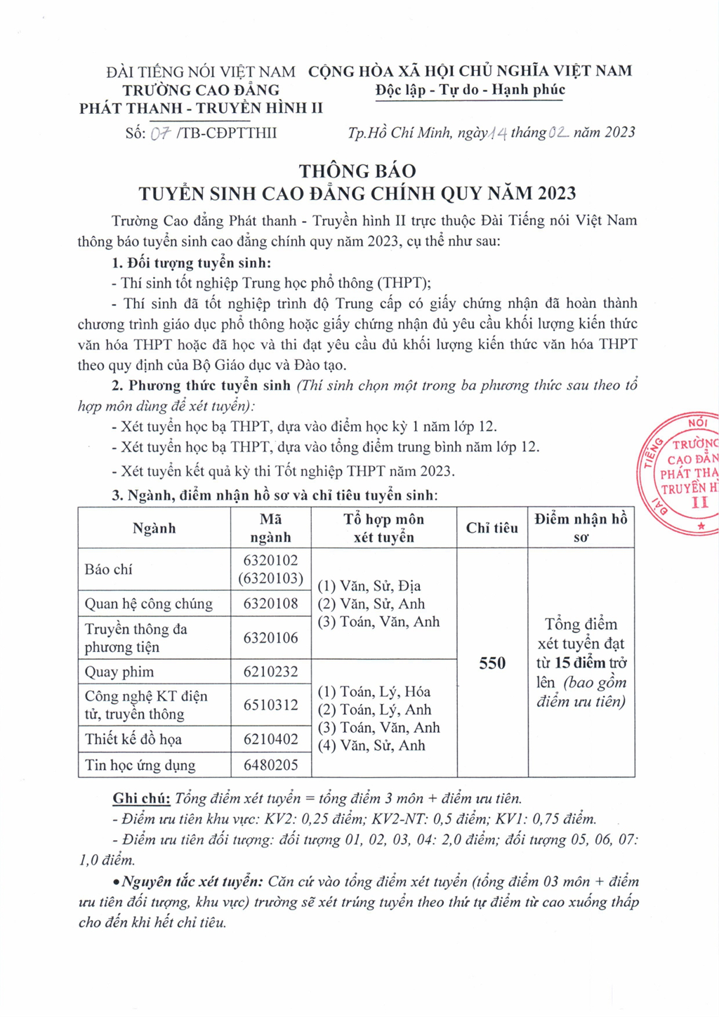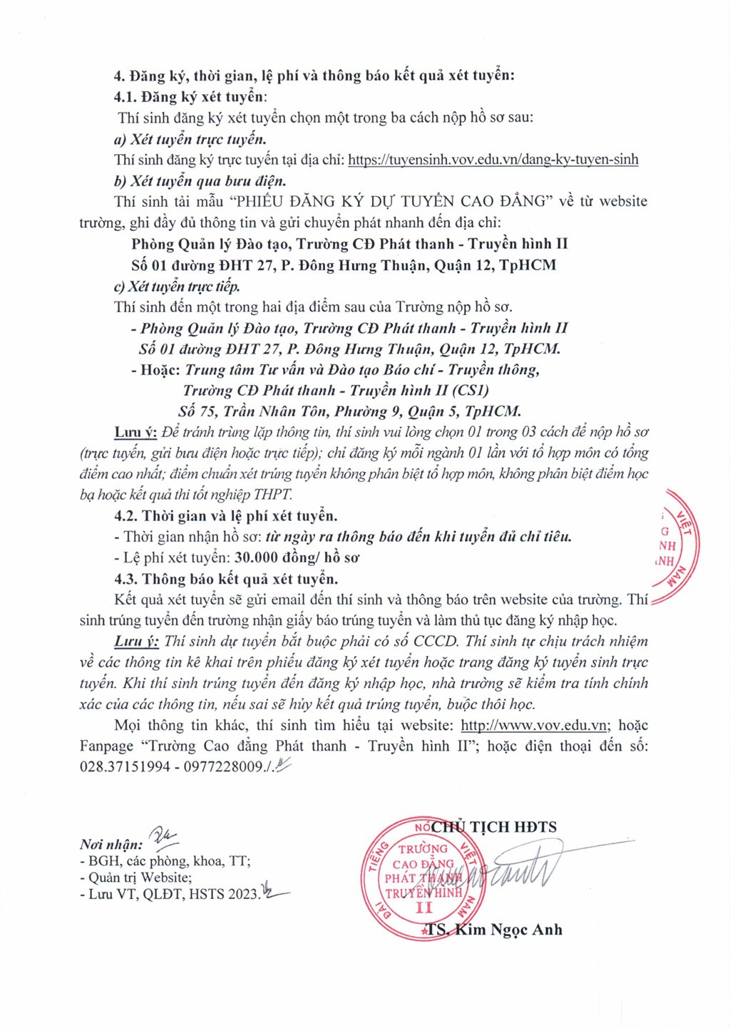 Mọi thông tin khác, thí sinh tìm hiểu tại website: http:\/\/www.vov.edu.vn; hoặc Fanpage “Trường Cao đẳng Phát thanh - Truyền hình II”; hoặc điện thoại đến số: 028.37151994 - 0977228009./.
